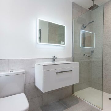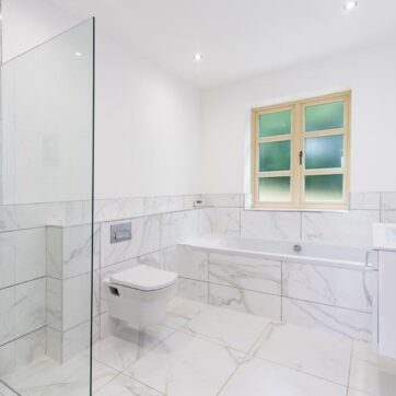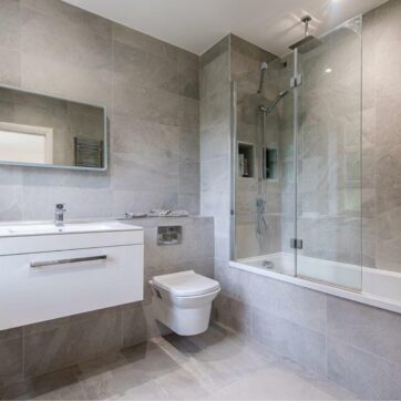 The bathrooms were kept neutral and versatile, designed to suit a range of potential homeowners, with fixtures and finishes chosen for both their timeless aesthetic and broad-market appeal.