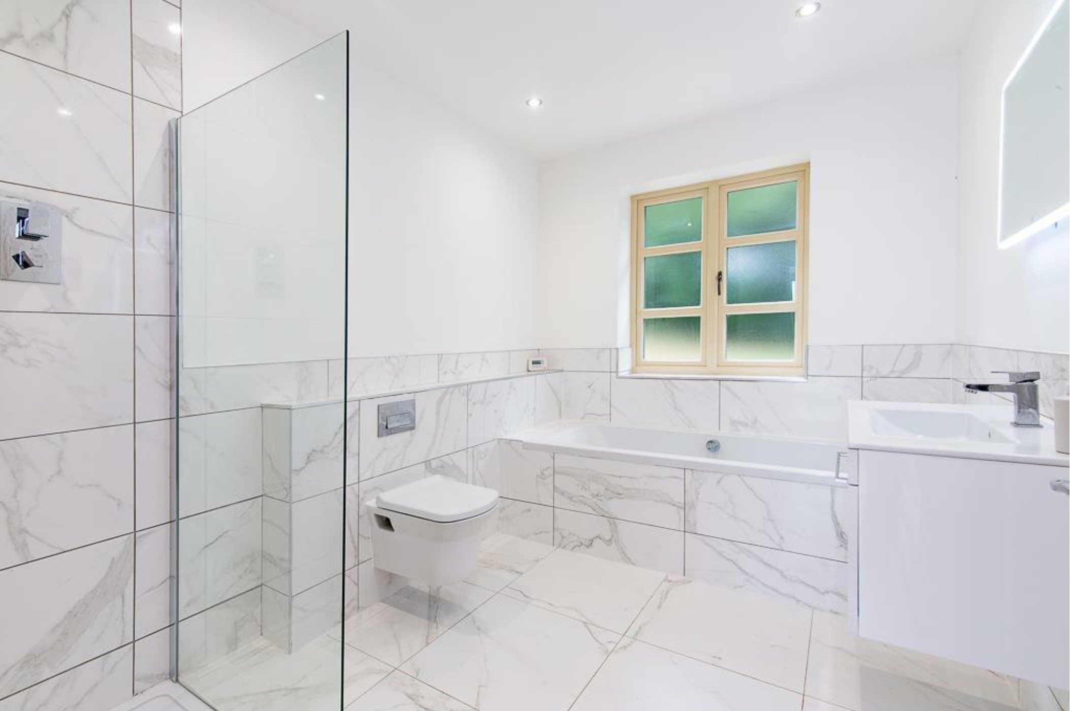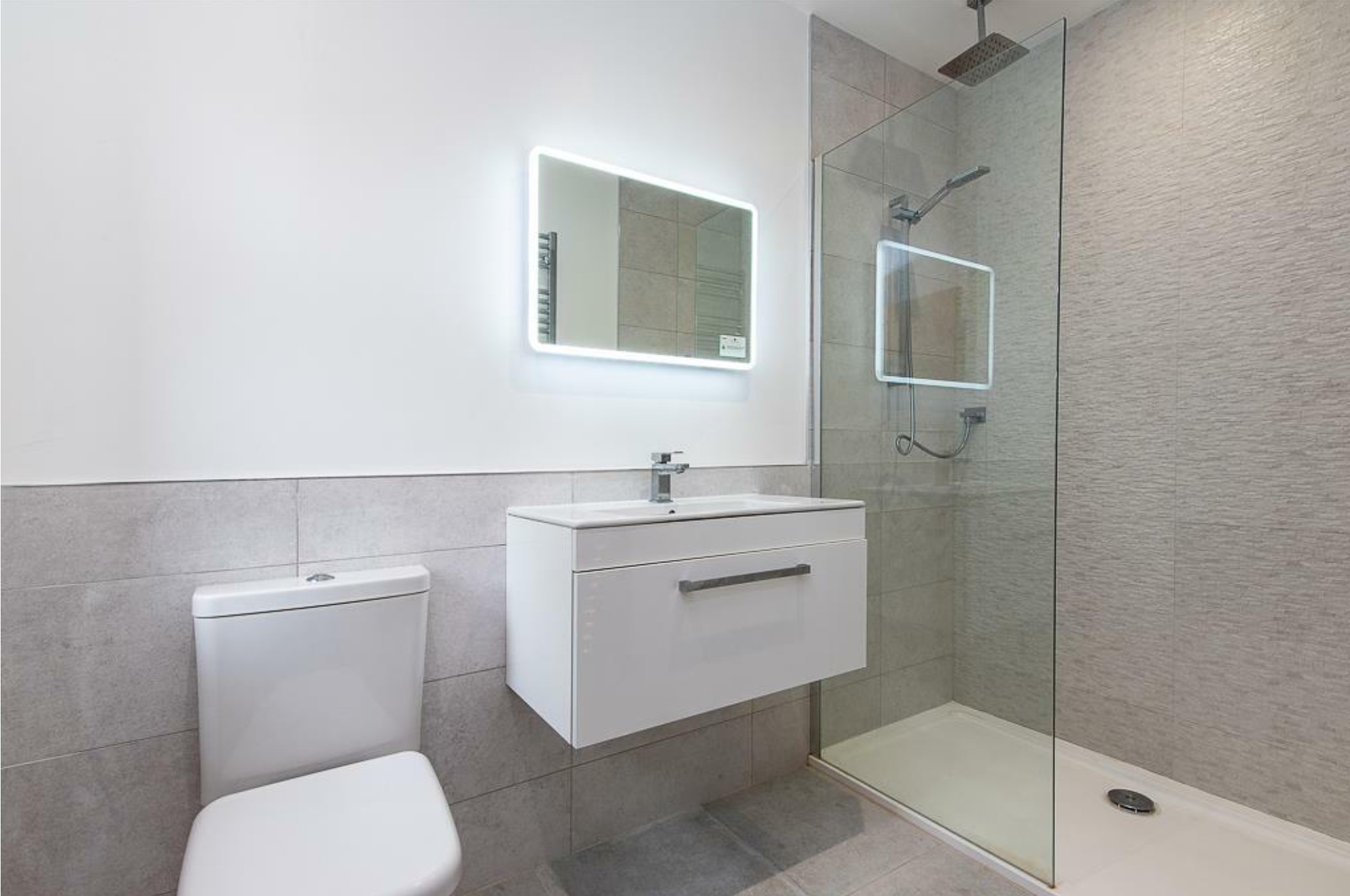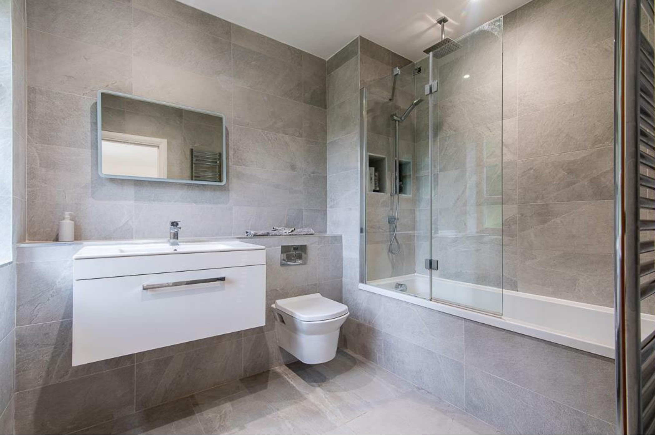 The bathrooms were kept neutral and versatile, designed to suit a range of potential homeowners, with fixtures and finishes chosen for both their timeless aesthetic and broad-market appeal.