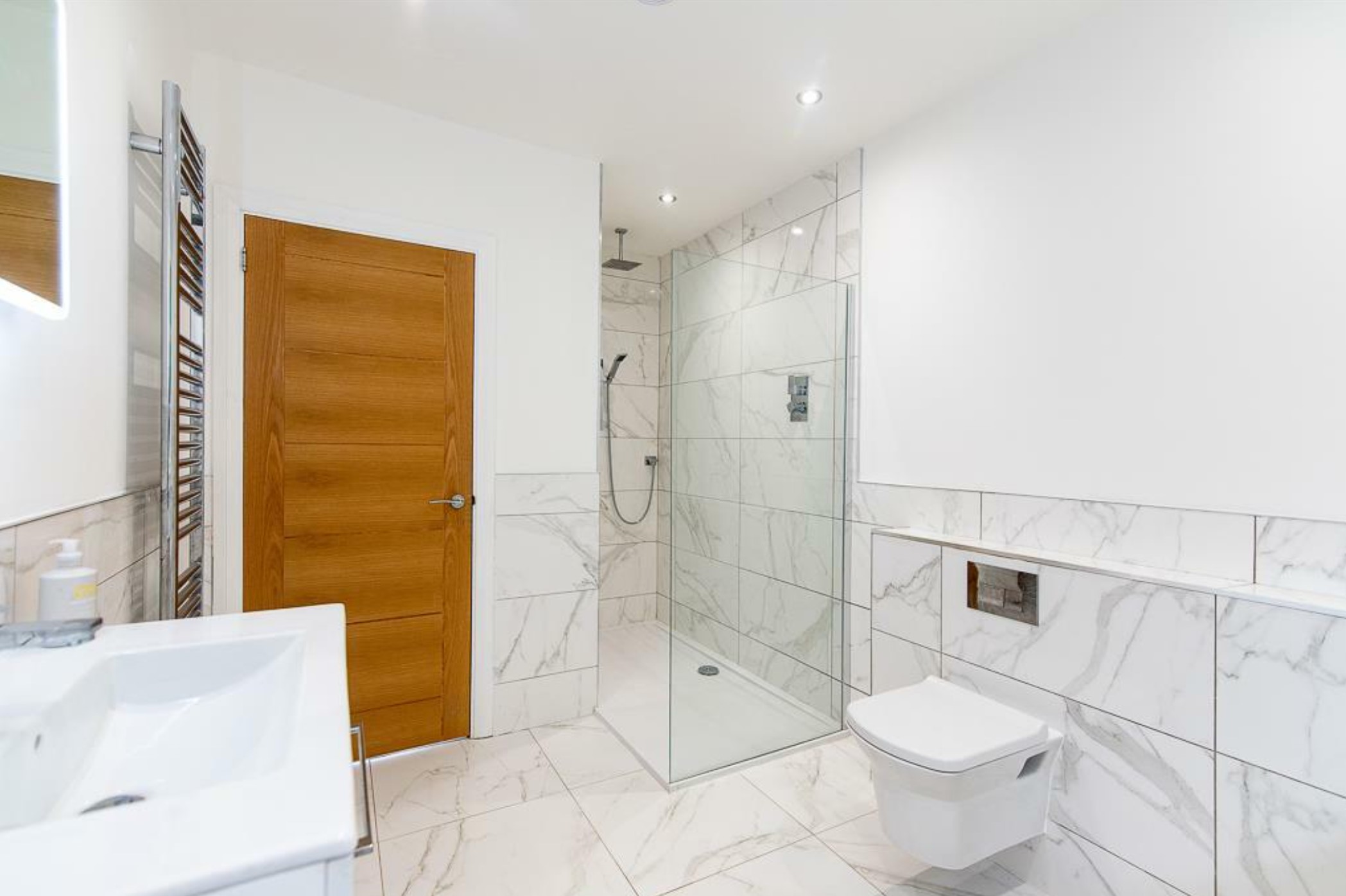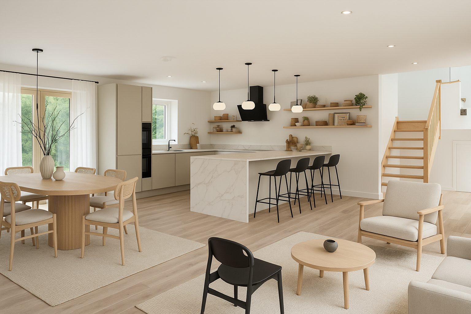 Inside, a sleek, handleless kitchen was installed with a striking marble waterfall-edge worktop, adding visual impact and durability. Floors were finished in ceramic wood-effect tiles, providing warmth and practicality, especially appealing in a high-traffic, family-friendly setting.